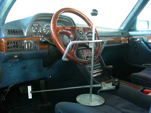 Vastzetten Het stuur wordt met een klem vastgezet en een andere stang houdt het rempedaal ingedrukt. Enne, ziet u het houten stuurtje? Die heeft Hildo laatst met een andere 280SE rijder, met de knip dicht, geruild tegen het originele vrachtwagenstuur. Dit veel kleinere stuur is beter voor de beenruimte, alleen zijn de instrumenten niet meer zo goed te zien. U kunt niet alles hebben.