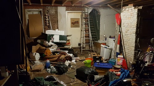 Even kort: De situatie in de schuur van het huis december 2017 De afgelopen 12 jaar had Hildo alleen stroom en verlichting in woonkamer en keuken. Met verlengsnoeren, eentje naar de gym voor de looplamp, eentje wasmachine, eentje droger en de rest met zaklamp. En zo zag het eruit tot december 2017. Later moet er ook nog een vloer in want tuintegels geven toch een beetje een rommelige indruk.