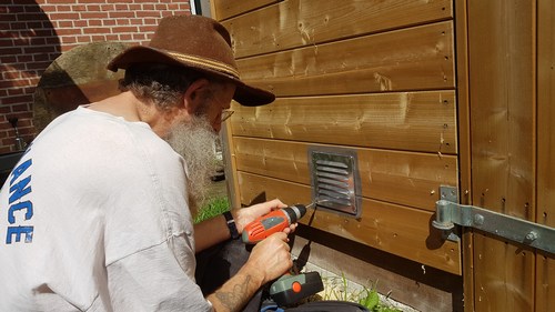 21 april 2018. Ontluchtingsgaten boren In verband met de schimmel en roest in de auto kiest Hildo voor ontluchtingsgaten. De zevengatenboor die hij heeft loopt heet, te veel wrijving. Een 40mm diameter houtboor wordt aangeschaft en die doet het heel redelijk. Vier gaten verder schroeft hij, met wat horrengaas ertussen tegen ongedierte, een aluminium ontluchtingsrooster ervoor. Vakwerk!