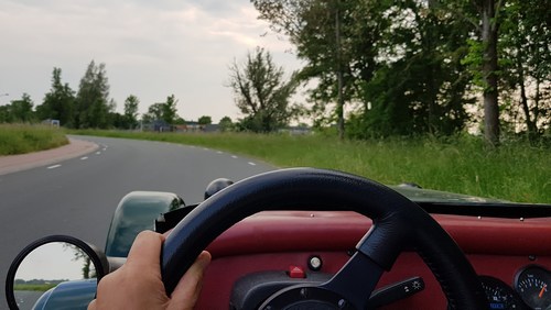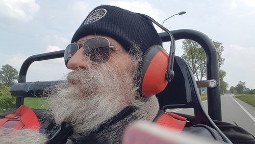 25 mei 2018. Zonder vooruit... het uitzicht Van een opwaaiende baard heeft Hildo zonder voorruit geen last meer. Hildo is aan de zijne inmiddels nogal gehecht geraakt, meer als aan de voorruit. Afgezien daarvan heeft zonder voorruit en deurtjes rijden een gigantisch voordeel, U kijkt nergens meer tegenaan, met name niet als er bochten genomen worden want de beugels die de voorruit vasthouden zitten behoorlijk in het blikveld. Volledig vrij zicht rondom de auto en dat maakt de rijervaring minimaal 100% beter, niet comfortabeler, maar een voorruit komt er nooit weer op. Lawaai is wel een probleem, hier wordt nog op gebroed. Spiegels U ziet wat Hildo ziet. Met name een groot groen spatbord. De spiegels moeten hoger. maar eerst die aeroscreen hebben. Communicatie met Engeland verloopt intussen moeizaam en niet omdat Hildo het Engels niet machtig is. Geduld is gelukkig een schone zaak.