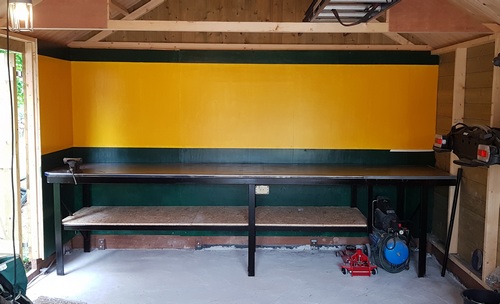 24 juni 2018. Groen-geel De werkbank is bijna klaar, de achterwand is geschilderd met veel geel anders wordt het donker en depressief. Het groen is wel heel erg donker uitgevallen, jammer. Volgende stap is de afwerking en natuurlijk het aanleggen van de elektriciteit en verlichting.