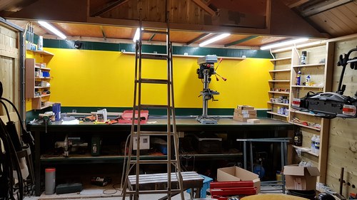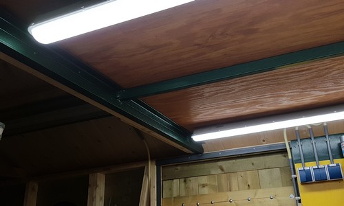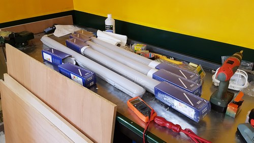 2 augustus 2018. Licht boven de werkbank In verband met het zoemen van de gewone tl´s is Hildo hier gegaan voor de iets duurdere variant: LED's met een niet verwisselbare buis. De levensduur zou 15 jaar bij een gebruik van 4 uur per dag zijn, las hij ergens. Mooi, want als dat zo is gaan ze langer mee dan Hildo zelf. Vier stuks 4000 lumen per lamp voor een overdadige hoeveelheid zoemvrij licht, verdeeld over de breedte van de werkbank zodat in z´n eigen schaduw staan ook hier nergens mogelijk is. Ze moeten nog worden gemonteerd aan een plafond boven de werkbank wat er nog niet is.