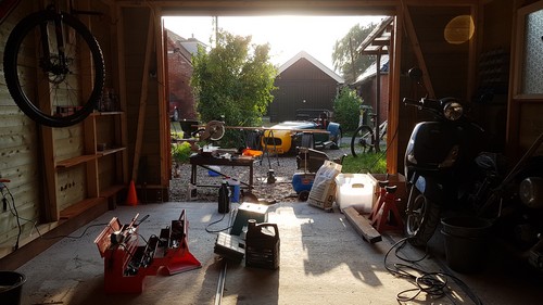 ![]() 20 oktober 2018. Plankjes en een zoldertje Met schier eindeloos schilderwerk aan de buitenzijde met een serie beitslagen voor een goede weerbestendigheid is er, hopelijk, een drogere stalling voor de Westfield gezorgd. En verder gaat het Eerst met wat plankjes aan de zijkanten om wat spulletjes van de vloer af te krijgen. De vloer is om op te lopen nietwaar? ![]() 21 december 2018. Staalondersteund zoldertje Hout is een mooi materiaal, Hildo vindt van niet. Het is onbetrouwbaar, scheurt, rot, begint door te hangen etc. Staal is veel beter en is, bij dezelfde afmeting, veel sterker. Door lassen is het gemakkelijk aan te passen naar de behoefte. Daarom heeft hij het de houten dwarsbalk balk verstevigd met aan elkaar gelaste stalen hoekprofielen en stalen balkjes ondersteunen de vloerplaten. Hier durft Hildo wel overheen te lopen of onder te staan en mettertijd gaat het niet doorhangen. Het hout is gebeitst en het staal stemmig hamerslag groen, wat heel redelijk overeen komt met de kleur van de Westfield. Mooi hoor, Hildo is hier superblij mee! ![]() ![]() 3 en 22 december 2018. Vochtprobleem De bovenste afbeelding is van 3 december, de onderste is drie weken later, op 22 december genomen, de toegenomen roest op de remschijf is duidelijk te zien. Er is iets helemaal niet goed in de garage. Het beitsen heeft niet geholpen en ook de gaten met de rooster voor de ontluchting lijken niet goed te helpen. Resultaat? Als Hildo hier niets aan doet is het duidelijk wat er gaat gebeuren, van de Westfield blijft er niets over dan een polyester bak ellende op wielen. ![]() 25 december 2018. Nat ontluchtingsrooster voorkant Het ontluchtingsrooster is gemonteerd, daarna is er gebeitst. Aan de voorkant staat soms een stevige wind. Het regen water wordt door het ontluchtingsrooster naar binnen geblazen, en kan er niet weer uit. Tussen hout en rooster komt water te staan. Het hout is doorweekt, het peil wordt steeds hoger totdat het zelfs door de gaten naar binnen loopt en ook binnen is het hout kleddernat. Onderkant van het rooster open maken? Dat is een oplossing die voor de hand ligt, maar Hildo wil helemaal niet dat er water door het rooster naar binnen kan lopen. Even over nadenken en kijken of er een simpele oplossing voor is. ![]() ![]() ![]() 29 december 2018. Na 12 uur op de lage stand De luchtvochtigheid is na 12 uur gedaald van 86% naar 82% en de watertank bevat 2.7 liter water. Lijkt niet al te veel maar het is de moeite waard. ![]() 1 januari 2019. Een droog begin van het nieuwe jaar! Om 14.22h de droger aangezet en de relatieve luchtvochtigheid is 77%. Om 17.12h uitgezet op 70%, met ongeveer 1 liter water in de watertank. In totaal zal de droger nu iets van 6 liter water uit de lucht gehaald hebben. Waarschijnlijk was het vocht grotendeels al uit het hout, auto en alle andere vocht absorberende zaken getrokken. Hildo vermoed dat het vocht wat uiteindelijk nog in de lucht hangt zit ook alleen maar in de lucht zit en dat het daarom relatief snel weer te verwijderen is. De lucht wordt ook snel weer vochtig maar de spullen zijn nu wel veel droger, goed te merken aan papier en karton. Kortom, 'Dit ding is z'n geld waard', aldus Hildo. ![]() 29 maart 2019. Kolomboortafeltje bijna klaar Het begint er inmiddels een beetje op te lijken. Poten zitten er redelijk onder. Uren bezig geweest om met name het randje, rondom het houten blad te lassen, slijpen en passend te krijgen. Maar het is gelukt! ![]() Het jaar 2001 op 4 april. De oude werkbank Zo zag Hildo's midden jaren 90 gebouwde werkplaats achter in de schuur er destijds uit. Stemmig oranje/zwart, de Harley-Davidson kleuren. De kolomboor die er staat had hij geleend om met een, zelfgemaakt stukje gereedschap, de klepveerspietjes los te kunnen halen om de kromgeslagen kleppen te kunnen verwisselen want... een klep moet wel eerst dicht gaan voordat de zuiger weer omhoog kan en daarbij zijn er grenzen aan toerentallen en de lengte van strepen die er te trekken zijn. In 2005 is er een nieuwe muur gebouwd en daarmee kwam er een einde aan het bestaan van deze werkplaats. Het gereedschap verhuisde naar de zolder in verschillende emmers. ![]() Het jaar 2019 op 7 april. De nieuwe werkbank Bijna op de dag af 18 jaar later, na de foto hierboven gemaakt is, en na 14 jaar het gereedschap in emmers heeft Hildo dezelfde werkbank, in aangepaste vorm, er weer staan met vrijwel hetzelfde gereedschap als destijds. Divers gereedschap stamt nog zelfs nog uit zijn brommertijd. Wat weggeraakte sleutels etc. zijn opnieuw aangeschaft. Maar de werkbank is nu mooier, met de staalplaat erop, de legplank er onder, stopcontacten, de fantastisch heldere LEDs en is zelfs iets breder! Iets van kastruimte staat nog op de 'to-do' lijst, maar dan komt nog wel. Als hij straks met z´n twee linkerhanden aan de Westfield moet sleutelen is het vast beter te doen want de nieuwe werkplaats annex garage is alvast een prettige ruimte om te zijn. |
