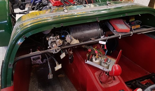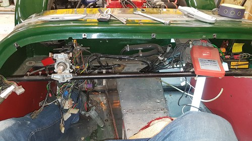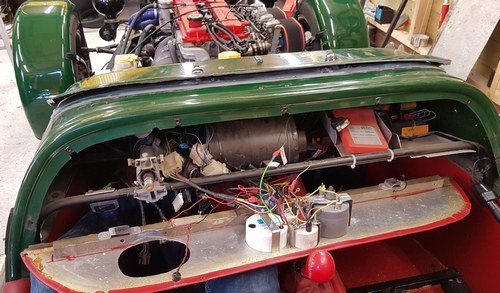 25 april 2019. Voorlopige eindstand Het oranje kastje is een computer programmeerbare ECU van de firma MBE, ontsteking only, voor carburateurs. Het gebeuren rechts zal wel iets uit te staan hebben met de startonderbreker en/of het alarm, hij heeft er nog niet naar gekeken. Rechts onderaan zitten zekeringen en een aluminium plaat met een rode LED. Later maar zien.