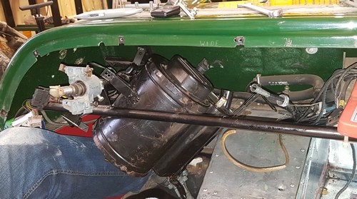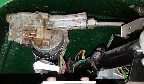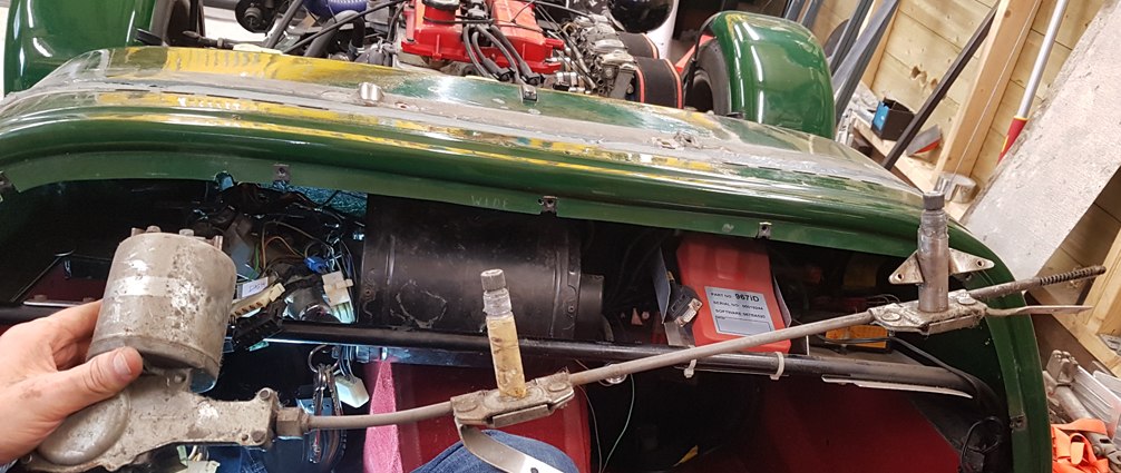 25 april 2019. Ruitenwisser-motor en stangen Het is een ééndelige constructie. Eerst de aandrijfstang met asjes waar de ruitenwissers aankomen, losdraaien en uit het polyester trekken. Daana de ruitenwissermotor nog loshalen, die met een grote slangenklem op een beugel vast zit. Ook het ruitenwisserspul komt er niet weer in.