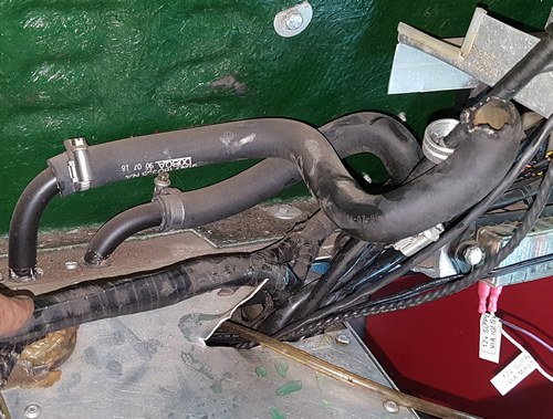 25 april 2019. Kachelradiateurleidingen Deze alvast even losgedraait want deze moeten eraf. Het goudkleurige ding bij de rode peil is de schuif voor de verwarming. Kachel aanzetten? Moest de motorkap eraf. De 'uitlaat' van het Raceline systeem kan afgedopt volgens Hildo. Het expansievat wil Hildo houden, hoe de leidingen straks aangesloten worden moet hij eerst even googelen. |