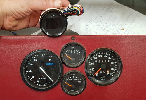 19 april 2019. Toekomstplannen Nieuw minder laag dashboard maken uit aluminium zodat er meer ruimte is voor Hildo's knieën. De snelheidsmeter/kilometerteller wil hij vervangen door het bovenstaand klein 52mm diameter digitaal exemplaar met GPS aandrijving met antenne uit China. Past in uiterlijk en maat mooi bij alle kleine 52mm VDO instrumenten. Alle controlelampjes die in de middenconsole zaten zitten nu in de nieuwe snelheidsmeter dus dat ruimt op. De twee VDO instrumenten uit de middenconsole zullen verhuizen naar het dashboard. Het wordt dus één 80mm toerenteller met vijf kleine 52mm instrumenten, een drukknop om de GPS teller te kunnen bedienen en de shiftlight wordt ook weer gemonteerd. Geanodiseerde aluminium plaat En aluminium plaat van 1.5mm dik staat in bestelling. Hiervan wordt behalve een nieuw dashboard ook nog een kofferbakdeksel gemaakt. Het is de vervanging voor de tonneau cover, die al eerder verwijderd was. Het ding 'hapte' lucht zonder voorruit en ging bol staan. Nog zwaar ook. |