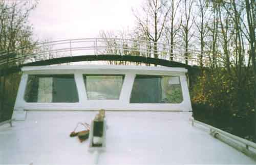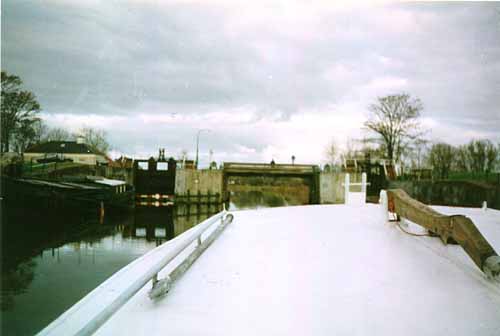 Uitzicht vanuit de kajuit op de brug/sluis van Schouwerzijl, zo meteen het Reitdiep weer op. Zolang het goed ging, ging het mooi. Jammer dat goede dingen vaak niet lang duren.