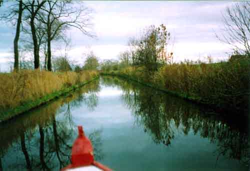Het water zo glad als een spiegel. Door de Groningse maren varen is geweldig.