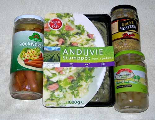 ___________________________________ Menu 'Stamppot Pit' Benodigdheden: Aldi stamppot, bockworst, pittige mosterd, zilveruitjes en (niet afgebeeld) zakje instant jus.