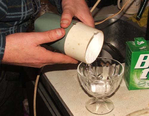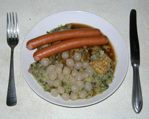 Hier het venkelmenu. Aardappelen, instant jus, gehaktballetjes, gekookte venkel en voor de exclusieve uitstraling, een instant groentesausje met kaassmaak. Hildo moet toegeven dat het zonder sausje minstens zo goed smaakt, beetje jammer om de pure smaak van Venkel te maskeren. Rauw Alles proberen natuurlijk en ongekookt is het minstens zo lekker. De anijs/dropsmaak is dan veel meer aanwezig. Rauw kunt u het ook met van alles mengen, honing bijvoorbeeld. Kortom, best lekker spul hoor! Grote nadeel ten opzichte van Hildo´s grote favoriet, de pizza? Wel wat meer werk en tijd.