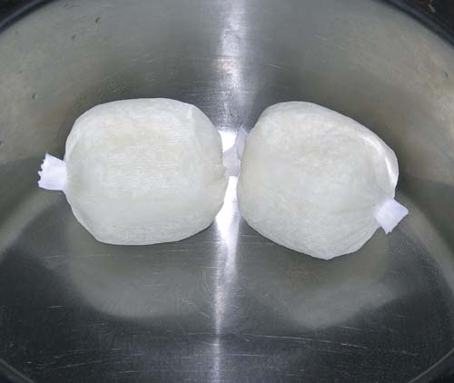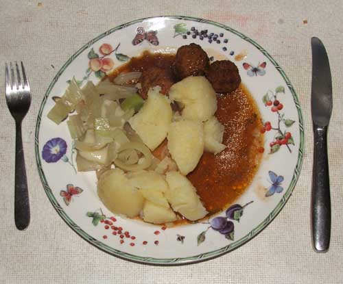 Een enkele of zelfs twee knödels zijn ruim voldoende om uw honger te stillen. Het voelt als een soort knisperende rijst in zakjes wanneer u er in knijpt, maar het is volgens Hildo een soort van aardappel zetmeel product. De knödels worden gekookt in water, een minuutje of 8. Daarna het niet eetbare zakje verwijderen. U heeft nu een soort van klomp aardappel deeg. Dezelfde consistentie als de binnenzijde van een oliebol die niet gaar is. De knödel zelf smaakt naar niets, maar u dient ze in te zetten als een gekookte aardappel. Er moet iets bij, liefst iets wat een sterke smaak heeft. Knödel met rode kool, slavink en wat jus is een goede combinatie bijvoorbeeld. Wat Hildo hieronder heeft samengesteld is ook prima te verteren.