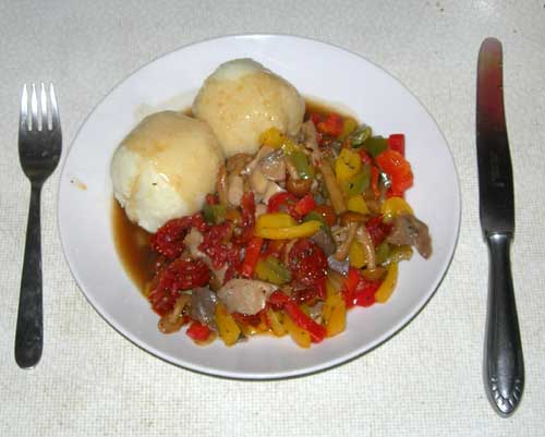 Knödel met paprika, tomaat, een sortering paddenstoelen en alles ruim voorzien van jus.De jus is belangrijk want een knödel is nogal kleverig en zonder wat extra sappen hebben ze de neiging een beetje in uw keel te blijven steken. Voor af en toe helemaal geen gek spul hoor!