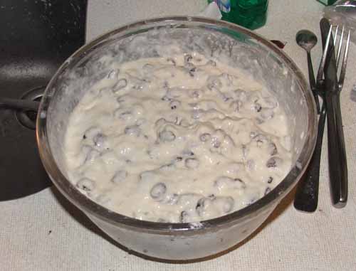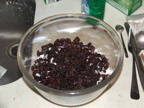 De oliebollenmix gaat in een glazen schaal. Bij 500 gram bloem hoort ook 500 gram rozijnen. Dat maakt dat deze oliebol včr boven het normale niveau uitstijgt, zegt Hildo, en u heeft naderhand ook niet zoveel poedersuiker meer nodig.