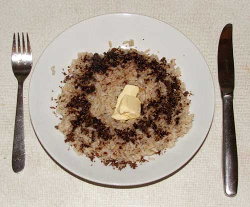 Nogmaals een bijna vergeten recept uit de keuken van Hildo's voorouders, ze hielden van gevarieerd eten hoor! Hildo's moeder maakte het ook graag, en hij heeft het leren te waarderen. Zowel in smaak als bereidingsgemak. In het Groningse dialect heet dit menu eigenlijk 'dikke riest', maar dat doet er verder weinig toe. Bereiding U kookt de rijst, maakt niet uit wat voor soort, gaar in een pan met water. Niets bijzonders. Koken in melk deden sommige mensen ook, maar de logica ontgaat Hildo want koken in melk brengt allerlei problemen met zich mee, van vastgebrand in het pannetje tot een overkokende smurrie. Nooit doen dus, bovendien is het ook nog duurder dan water. Als uw rijst gaar is gooit u een hoeveelheid in een bord, en maakt een kuiltje in het midden. Een klont margarine wordt in het kuiltje gedeponeerd. Suiker, basterdsuiker of gewone witte, uitstrooien over de rijst. Zorgt u er wel voor dat uw boter goed gesmolten is alvorens te beginnen? Dat maakt het zoveel lekkerder, daarom hoort dit menu eigenlijk eerst nog even op de kachel na te 'garen' tot de boter goed gesmolten is. Veel mensen hebben nu geen echte kachel meer, pech voor hen. Hildo lekker wčl! Smikkelen maar weer!