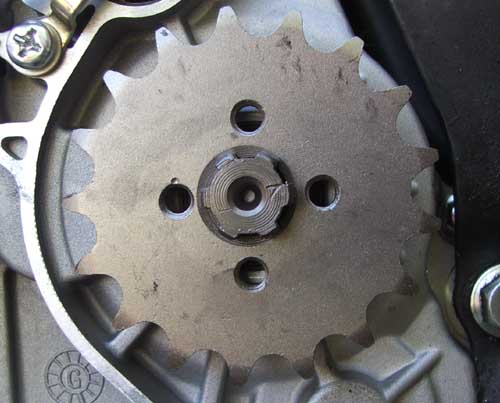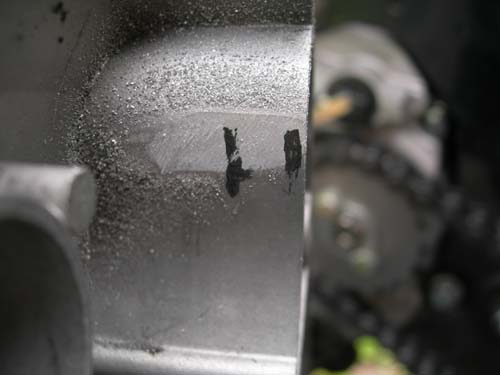 Zijdekselmateriaal wegvijlen/slijpen Het linker zijdeksel van het Daytona carter is, in tegenstelling tot het standaard Skyteam blok, uit één stuk en zit over zowel de ontsteking/alternator rotor als de versnellingsbaktandwiel van de secundaire aanrijving heen. Het grotere 18-tands tandwiel komt tegen het deksel aan. U ziet dat de ketting de binnenkant van het zijdeksel raakt (de twee zwarte strepen). Hildo besluti daarom steeds een beetje meer aluminium weg te halen en uiteindelijk loopt het tandwiel vrij zonder dat er een gat in het aluminium zit.