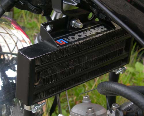 3 september 2012. Lockhart oil cooler Niet de imitatie Takegawa oliekoeler die nog voor 100 euro bij Staxter is aangeschaft, maar een Lockhart is afgelopen weekend gemonteerd. Hildo duikelde het ding op onder allerlei zooi op zijn werkbank, dacht dat er nog een oude Eend (2CV) koeler zou liggen maar het bleek zijn eigen oude Lockhart die ruim 20 jaar geleden nog dienst gedaan heeft op de Harley. Het ding verkeert nog in prima staat, dus de Takegawa imitatie koeler gaat voorlopig de kast in. Rustig rijden Het inrijden is gedaan zonder koeler. Het blokje raakt niet oververhit tijdens het rondtoeren met een tempo dat schommelt tussen de 60-65 kmh. Nu is er ruim 400 km ingereden, de koeler er nog even op en er kan langzamerhand wat vlotter getuft worden. Gas er op!
