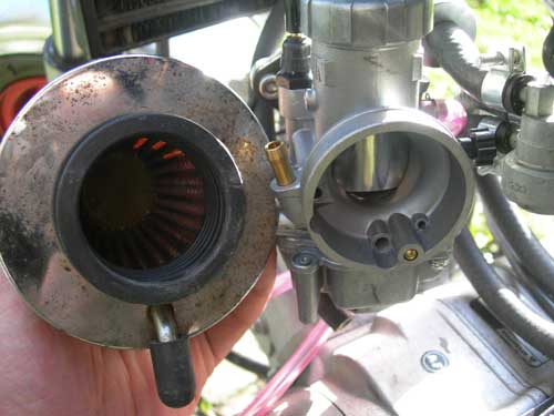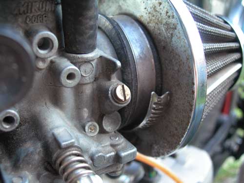 19 oktober 2012. Luchtfilter past niet Het Takegawa (K&N imitatie) filter voor de Mikuni VM26 is 42 mm aan de binnenzijde, maar de Keihin luchtinlaat is groter. 49 mm om precies te zijn. Even zoeken, de K&N R-1060 (zwart eindkapje) of de RC-1060 (chroom eindkapje)hebben een binnendiameter van 49 mm en zijn verder gelijk aan het filter dat er nu op zit. Lijkt goed, nu nog even bestellen. Voorlopig wordt het oude luchtfilter gemonteerd met wat aluminiumtape, als ie maar even zit. Uitschimmen benzinekraanbeugel De luchtstelschroef en de stationairstelschroef zijn ongelukkigerwijze aan de rechterkant van de carburateur geplaatst. Voor de stationairstelschroef is er niet genoeg ruimte. Helemaal rechts op de afbeelding hierboven is het nog net te zien. Een paar ouwe cilindervoetmoeren van een Shovel achter de benzinekraanbeugel in combinatie met met een M6x60 lange bevestigingsbout en het past prima. Even wat kunnen draaien aan de carb is noodzakelijk.