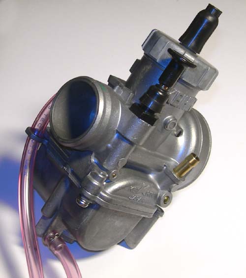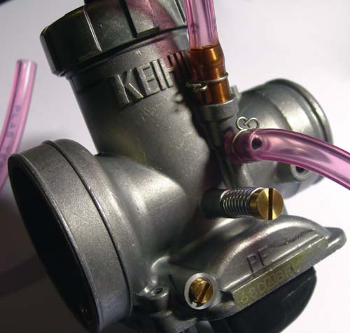 14 september 2012. Keihin PE28 Dit is de 28 mm carburateur die Daytona aanraadt voor Hildo's 150cc Daytona tweekleps blok. Niet de originele van Daytona, beetje heel veel geld voor dezelfde carb. Hildo vindt het een rommelig ding door de chaotische roze slangetjes. De Mikuni VM26 is mooier. Het is gewoon een carburateur, met een ronde gasschuif, niets bijzonders aan te zien. Hoeft ook niet, als ie het maar goed doet. Foute kant Het valt direct op dat de stationairschroef en de luchtmengselschroef aan de rechterkant zitten. Das niet handig met een Dax, want daar zit de benzinekraan.