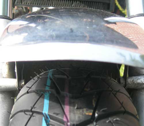 23 september 2012. Voorband... te breed rubber Een Bridgestone ML50 schijnt het goed te doen, volgens wat reviews links en rechts. De maat 100/80-10 aangeschaft. Te breed! Past niet tussen de vorkpoten, of in ieder geval komt de band tegen de bouten van de spatbordbevestiging aan. Even de rolmaat erbij en zo recht mogelijk kijken: De originele 3.50-10 Bamiband is ongemonteerd ongeveer 91 mm breed. De Bridgestone is geen 100 mm maar valt breder uit, 107 mm ongemonteerd. Dat maakt de Bridgestone in totaal 16 mm breder dan de originele band en dat is te veel van het goede. De spatbordbevestiging aanpassen, vastgegoten aan de vorkpoten, daar begint Hildo niet aan. Voorlopig wordt de oude voorband nog even ge(her)monteerd tot er nieuw rubber binnenkomt.