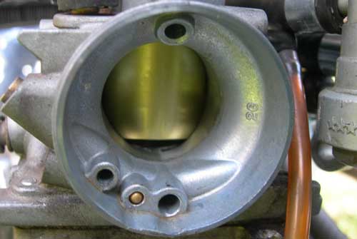 Venturi, van voren naar achteren Midden onderin zit het gaatje dat de brandstof levert van de stationairsproeier. Rechts ziet u het gat van de 'choke' (mengselverrijker).