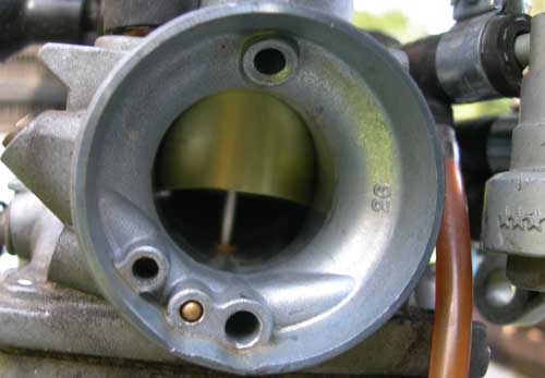 Venturi, van achteren naar voren Links zit het gat voor lucht voor de choke (mengselverrijker, het is geen échte choke). Het gat midden onderin (achterin de carburateur) is de remluchtsproeier. Als Hildo naar binnen kijkt, blijkt er geen sproeier gemonteerd te zijn. Het is gewoon een niet af te stellen open gat. Bij de brandstof, die door de hoofdspoeier naar binnen gaat, wordt in de mengbuis lucht bijgemengd vanuit de remluchtsproeier zodat er er al wat lucht bij de benzine zit op het moment dat het de venturi in gaat. Helemaal rechts onderin ziet u het gat van de luchtmengselschroef die meer of minder lucht toelaat tot de stationairsproeier. Het ronde messing bolletje rechts binnen in de venturi is de stationairschroef, verder indraaien en de gasschuif wordt iets omhoog gedrukt zodat de stationaire snelheid toeneemt, of andersom, afneemt.