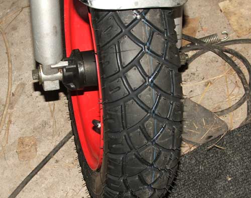 23 september 2012. Voorband nog niet versleten maar... De Dax is in de zomer van 2008 aangeschaft en nu, vier jaar later en 14.000 km verder, is het profiel nog steeds diep. De gewichtsverdeling van de Dax, inclusief berijder, is niet ideaal. Het grootste gedeelte van het totaal gewicht rust op de achterband, beetje afhankelijk van hoe ver u naar achteren zit op de buddy. De voorband slijt derhalve nauwelijks maar de band begint uit te drogen. Oudere banden worden ook harder en de grip wordt er niet beter op. Hildo gaat voor een nieuwe voorband!