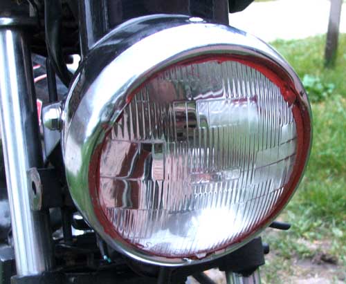Siliconen koplamp Niet mooi, maar het zit. Later de rode smurrie er nog even zo goed als mogelijk afpulken. Sealed beam in de praktijk Op de weg is het pas mogelijk echt een goede indruk te krijgen, daarom rijdt Hildo in het pikkedonker even een ommetje. Grootlicht valt tegen, misschien doordat 50W een beetje te veel is om nog goed te laten branden. Dimlicht is beter. Superfel is het niet, duidelijk gelig en een slordige lichtbundel met veel strooilicht, het heeft wel wat van een brede zaklampbundel. Hier zit geen Hella-reflector in! De bundel is links en rechts even hoog en in het midden zit een bult. Misschien dat de gemiddelde Amerikaan in zijn Pontiac het prima vindt, maar Hildo zegt: 'Dit is geen kwaliteit'. Lichtopbrengst? Beter dan de H4-unit het wist te doen met weinig stroom, maar de sealed beam valt toch tegen. Het is zeker niet te vergelijken met een volop brandende reguliere 55/60W H4 lamp en het blijft een ondermaatse verlichting. Jammer, maar wat had u verwacht van 35W? Hildo laat het hier bij zitten. In het donker is er nog redelijk mee te rijden. De Dax zal toch vooral in de zomer ingezet worden en dan is de nacht maar kort en sneller te vermijden.