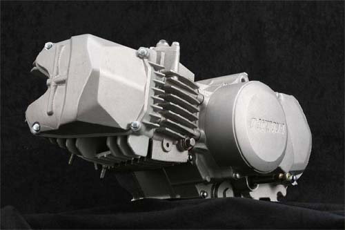 Het 150E Daytona motorblok En hier gaat het natuurlijk om! Snel, sterk en bewezen betrouwbaar. Een uitontwikkeld concept zonder kinderziektes, want het is al een poosje op de markt. Het is met name ontwikkeld voor gebruik in pitbike crosswedstrijden, waar zo'n blok het goed voor z'n kiezen krijgt. Het is dus een ècht raceblokje! Toen het blok net ontwikkeld was, was er sprake van problemen met de versnellingsbak en het carter, maar die schijnen nu opgelost te zijn. Het ziet er netjes en verzorgd uit, wat wil een mens nog meer? Vermogen Daytona geeft op dat het blok 18pk heeft (rond de 15 tot 16 pk aan het achterwiel, naar het schijnt). Met ongeveer het dubbele aan vermogen wil de Dax straks vast wel vooruit! Nog sneller? De standaard compressieverhouding van de Skyteam Dax is 9:1, de Daytona 150E zit op 12,5:1 en dat is best hoog. Optioneel is nog een 13,8:1 hoge compressie zuiger te krijgen en ook een hetere nokkenas. Dat ziet Hildo niet zitten: betrouwbaarheid en levensduur zijn belangrijker dan een paar pk's extra. Levensduur Deze blokken zijn best van redelijke kwaliteit, naar de verhalen te oordelen die Hildo erover gelezen heeft. Ze houden het beter uit dan de gewone China-blokjes in pitbike wedstrijden bijvoorbeeld. Maar hoe bevalt de Daytona nu op straat? Hoe zit het met zaken als verbruik en levensduur als er in het verkeer op een normale wijze mee gereden wordt? U wordt op de hoogte gehouden!