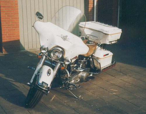 Februari 1985. Hildo's eerste Harley uit 1977 Deze Harley-Davidson werd op kerstdag 1984 aangeschaft, was het iets van 14.000 gulden die het ding kostte? De bankrekening had er in ieder geval behoorlijk onder te lijden. Een parelmoerwitte Electra Glide uit 1977 met alles erop en eraan, inclusief lichtrail. Aaaargggh! Half jaartje gehad, maar dat het een Harley is zegt ook niet alles. De ouwe lullebak ingeruild tegen onderdelen want een chopper moest er komen.