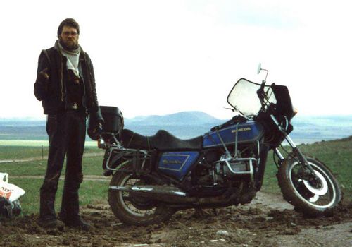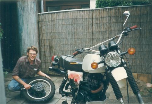 Zomer 1986. Dezelfde Yamaha XT500 uit 1980 De XS1100 werd verkocht en Hildo ging weer op zoek naar een XT500, was toch een fijn fietsje geweest. Toevalligerwijze stond er net eentje in de krant, Hildo naar Ruinen. Bleek daar z'n eigen ouwe XT te staan! Toeval of iets anders? Hildo kocht de motor voor 2000 gulden en die is tot 1999 in z'n bezit gebleven. Het big end was op een gegeven moment goed hoorbaar, maar een andere XT-blok deed wonderen. Na een top-end revisie veloor Hildo, naast de zijstandaard, ook zijn geduld en een moker en slijptol veranderde de XT in een schroothoop. Hildo heeft zich nooit weer druk hoeven te maken over de XT500. Hildo heeft het kenteken vernietigd en de motor werd 'in eigen beheer gesloopt', aldus de formulering van het RDW. Op de bovenstaande foto maakt Hildo de XT klaar voor een rit naar en door IJsland in 1986.
