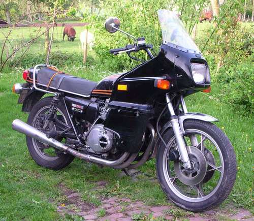 Zomer 1980. Suzuki GS750 Special uit 1977 Volledig verbouwde GS750 uit 1977 met een zwart/oranje gespoten tank/zit combinatie, racekuip, racestuur en remschakelset. Het kontje achter het eenpersoonszadel herbergde nog een extra benzinetank (u kunt de dop zien zitten) met een aparte benzinekraan. Eén keertje al brandend van de snelweg gekomen en ook bij de dealer heeft de motor eens spontaan vlam gevat. Drie jaar oud op moment van aanschaf en een top van 230 km/h op de teller. Met de papieren op naam en een verzekeringsbewijs op zak naar de politie, want destijds was het zo dat, als u 18 jaar of ouder was en nog geen rijbewijs had, u een zogenaamde oefenvergunning kon ophalen waarbij u drie maanden vrijelijk mocht oefenen binnen de gemeentegrenzen. Daarna moest de vergunning verlengd worden. Tjonge, deze Suzuki was een stuk sneller dan de 70 cc Zündapp. Scheuren als een waanzinnige zonder rijbewijs of enige vorm van opleiding... Met 200 km/h in de bebouwde kom door natte sneeuw. Die goeie ouwe tijd waarin enigermate van verstand volledig afwezig leek. Na het behalen van het rijbewijs werd in 1981 een XT500 aangeschaft.