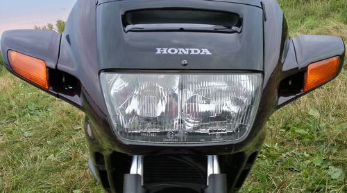 Dubbele koplampen Hildo wantrouwt motorfietsen met dubbele koplampen. Liever één grote dan twee lullige koplampjes. In het donker zou een automobilist een motorfiets met dubbele koplampen misschien kunnen aanzien voor een auto die ver weg is, zeker bij exemplaren die verder uit elkaar gemonteerd zitten dan bij deze motor. Een 'oeps' moment dat u niet wilt meemaken. Bij dimlicht is er maar één van de knullige koplampjes verlicht en Hildo is er niet van onder de indruk. Lichtopbrengst: belabberd! Tot nu toe vrijwel alleen lovende woorden over deze Honda, maar dat houdt bij de lichtopbrengst op. Die is rampzalig slecht. De lichtbundel lijkt op die van een gedeukte Chinese zaklantaarn en er is heel veel strooilicht wat tamelijk verblindend werkt voor tegenliggers. Dit is met vlag en wimpel de slechtste H4 koplamp met E-keur waar Hildo ooit mee gereden heeft. Met dimlicht brandt alleen de linkerkoplamp, met grootlicht branden beide koplampen en dan is het prima. Vroeger mocht een motorfiets maar één koplamp hebben met dimlicht, maar tegenwoordig zijn twee toegestaan. Het glas bij deze koplamp is verschillend, dus dit zal wel een oude constructie betreffen waarbij maar één dimlicht gevoerd mag worden. Misschien dat Hildo desondanks toch voor dubbel aansluiten van het dimlicht gaat omdat de huidige situatie niet voldoet in het pikkedonker van een maanloze nacht op het Groningse platteland. Hij wil graag kunnen zien waar hij rijdt maar dat lijkt, zoals het nu is, onder de maat... in ieder geval tot het grootlicht aangaat.