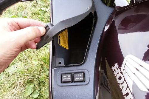 Sleutelvriendelijk? Alle moderne motorfietsen hebben erg veel elektrische toestanden aan boord en weinig is gemakkelijk toegankelijk, een regelrechte ramp voor mensen met twee linkerhanden. Hildo: ´Ik kreeg het kappie er al nauwelijks af voor de foto'. U kunt volgens hem, op olie bijvullen na, letterlijk nergens bijkomen zonder plastic kappen te verwijderen, als hij überhaupt al begrijpt waar alle technische toestanden voor dienen. ABS en tractiecontrole Het ding met de groene slangetjes, rechts van de blauwe schokbreker, is vast de ABS en tractiecontrole eenheid. Het werkt zowaar en er knipperen nog geen lampjes. De tractiecontrole werkt door het uitschakelen van de ontsteking. 'Knal!', zei de uitlaat toen Hildo het even uitprobeerde op een zandpad. 'Beetje onzin', aldus Hildo, die meent dat tractiecontrole gewoon op elke motor in het gashandvat zit. ABS is inmiddels verplicht, of wordt verplicht, op nieuwe motorfietsen maar ook dat zijn sensortjes waar Hildo maar geen vertrouwen in kan krijgen: is het inmiddels stuk of werkt het nog als u als een dolle in de remmen knijpt? Bij de achterrem werkt de ABS nog wel, met een ongesofisticeerd en luid 'klak-klak-klak'. De voorrem heeft Hildo nog niet geprobeerd.