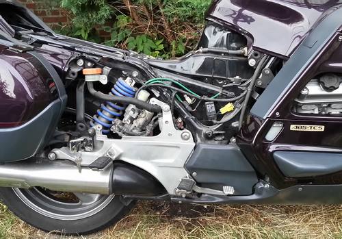 Hoe rijdt ie? 'Een zware is je ware', werd vroeger altijd gezegd. Wat dat betreft, heeft Hildo geen klagen want de Pan European weegt er behoorlijk in. Rijklaar volgens de gloednieuwe kentekencard, de traditionele 'kenteken papieren' zijn komen te vervallen sinds 1 januari 2014, is ie 290 kilo. Het leeggewicht weet Hildo niet, maar in de praktijk is het ding, leeg of vol, behoorlijk zwaar. Superstabiel rechtuit, superstabiel door de bochten. Maar snelle koerswisselingen, vlotjes links/rechts, is lastig en u merkt goed dat er behoorlijk wat gewicht heen en weer geduwd moet worden. Niet alleen een kwestie van gewicht, meer van rijwielgedeelte geometrie, een keuze van Honda en Hildo houdt er wel van. Prima tourfiets! Korte langzame bochtjes draaien met het stuur tegen of bijna tegen de aanslag betekent opletten, want als 300 kilo er even verkeerd inkomt dan gaat het snel een eigen leven leiden en houdt u er vast weinig meer aan. De achtervering is vrij slap voor een motorfiets, maar erg comfortabel. De demping is instelbaar, net als de voorveerspanning, maar Hildo zit er niet aan: prima zoals het is. De voorvering is ook slapjes, en volgens Hildo niet instelbaar, maar voldoet ook al prima. Laat die kasseien maar komen! Motorblok Met 100 pk is deze Honda V-4 met vier kleppen per cilinder en vier carburateurs voorzien van een prima vermogen. Meer dan genoeg om ook met een stevige tegenwind vlot te kunnen inhalen. De topsnelheid ligt ongetwijfeld ruim boven de vroeger 'magische' 200 km/h, niet dat het Hildo interesseert. Wat veel mooier is, is de 3100 a 3200 toeren die het blok draait bij 100 km/h, iets van 4000 bij 130 km/h en dat is heerlijk rustig. Ook bij een lager toerental pikt de motor goed en vlot op en in alle toerentallen blijft het die mooie, vrijwel trillingsvrije, loop behouden. Dit blok draait mooier, rustiger en stiller dan die van de K1100. Een lichte resonantie van iets is af en toe hoorbaar onder de imitatie tank maar het valt mee, loshalen doet hij het spul daarvoor niet. Cardan Uiteraard is deze 'Pan' voorzien van een cardan-aandrijving, anders had Hildo 'm niet willen hebben, en dat om precies dezelfde reden waarom u geen ketting aangedreven auto wilt. Gelukkig geen paralever systeem dat de reactiekrachten opheft, zoals bij BMW. Dus geen extra kruiskoppeling die kapot kan gaan zoals dat bij Hildo's BMW wél gebeurde, wat het einde betekende van de BMW. Eenvoudig dus superieur. U merkt er in de praktijk eigenlijk weinig van dat de motor omhoog komt tijdens acceleratie. Het voldoet prima.