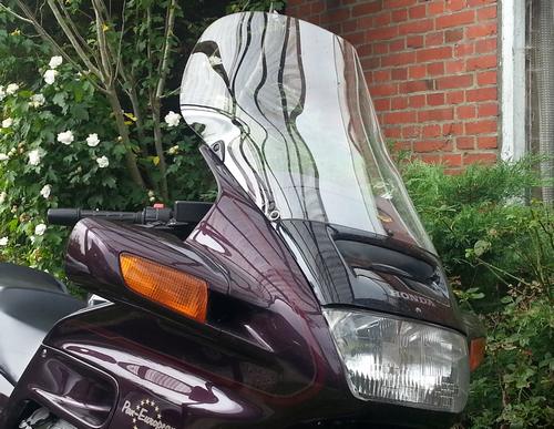 National Cycle vs origineel windscherm Het originele Honda scherm ziet er misschien beter uit, het is wat lager en getint. Wat Hildo betreft verhoogt een getint scherm het zicht op de weg niet en is het Honda scherm met name gewoon te laag, behalve voor wie een ver beneden gemiddelde lichaamslengte heeft. Het National Cycle scherm is even smal als de originele, maar is iets hoger en Hildo zit nu eindelijk met zijn hoofd redelijk uit de wind als ie normaal op de motor zit. Een wereld van verschil in rijcomfort en zeker een aanrader... maar toch blijft het verstelbare én bredere BMW K serie windscherm het beter functionerende ontwerp. Ook het vacuüm achter het scherm is groter en Hildo's baard heeft de neiging om in zijn ogen te wapperen, niet prettig. Mocht het u interesseren: Hildo betaalde voor deze kuipruit 129 euro, incl. verzendkosten.