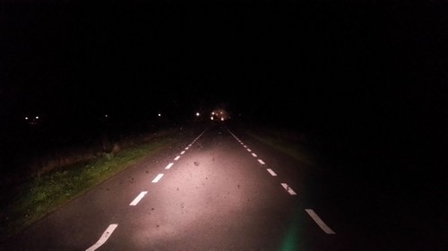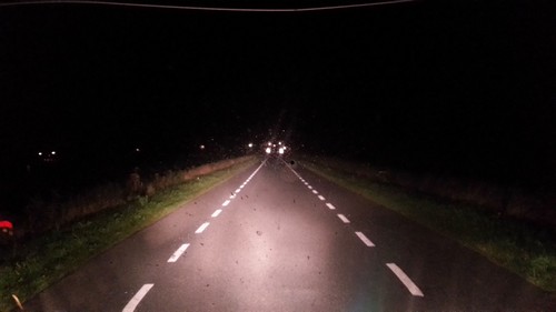 10 september 2014. Is het een zaklamp of een Pan European? Hildo had het er eerder over dat het dimlicht van deze Pan European wel wat lijkt op een gedeukte Chinese zaklantaarn en dat is niet overdreven. Hier ziet u de koplampverlichting van de motorfiets, precies in het midden van de weg tijdens een inktzwarte nacht. De tranen biggelden Hildo over de wangen na het aanschouwen van dit tafereel, vandaar dat een zakdoek eigenlijk bij de standaard uitrusting hoort van iedere ST1100 Pan European rijder die 's nachts onderweg is. Dimlicht (onderste foto) De lichtbundel is smal, rommelig en heeft erg veel strooilicht (zie de oplichtende borden aan het eind van de weg) De koplamp staat iets te ver naar links afgesteld en geeft geen zicht op de berm zoals dat hoort. Hildo vindt dit in de praktijk niet fijn rijden, al helemaal niet als hij de weg niet goed kent. En toch heeft deze koplamp daadwerkelijk het EC merkteken in het glas staan! Hij vraagt zich af hoeveel deze omkoopactie Honda gekost heeft. Grootlicht (bovenste foto) Met grootlicht gaan beide H4 lampen aan en twee lampjes van 60 Watt geven toch duidelijk meer licht dan eentje. Maar van een echt homogene lichtbundel is nog steeds geen sprake maar de grootlicht opbrengst is verder uitstekend.