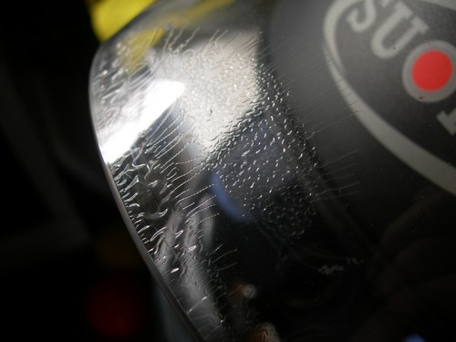 28 augustus 2015. Vizier coating laat los Door omstandigheden, een herseninfarct, heeft Hildo nog nauwelijks gereden met zijn Suomy helm, maar desondanks laat de anti-condenslaag van het vizier los. De helm heeft de hele tijd op een kast in de keuken gelegen, niets bijzonders mee gebeurt. Niet moeilijk Duidelijk een productiefout en bij Motoport Leek doen ze helemaal niet moeilijk over de garantie. Helaas hebben ze geen helder vizier meer in voorraad, maar Hildo heeft zelf nog een helder vizier op reserve dus een licht getinte versie als vervanger vindt Hildo ook okay. Lekker rustig aan de oogjes op een heldere dag.