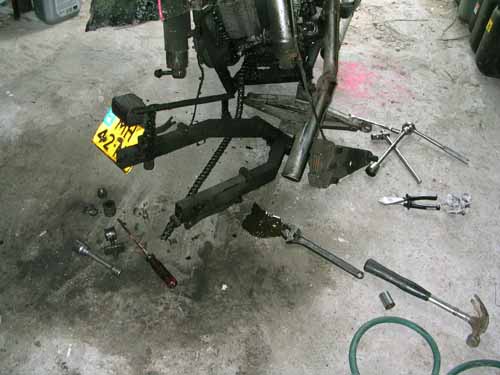 31 mei 2009. Gescheurd frame Hier valt Hildo's oog op tijdens de montage van de nieuwe achterbrug as. Het frame is gescheurd! Da's balen.