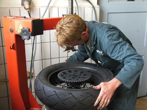 26 juli 2008. Eppie bandje monteren Nog even een voorbandje erom en Hildo kan weer duizenden kilometers vooruit.