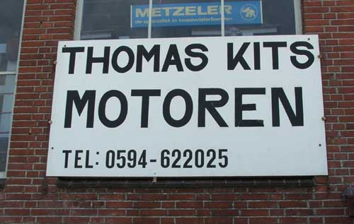 Thomas Kits Motoren - Ezinge Hildo komt af en toe bij Thomas Kits. 'Wat heb jij nou uitgevreten met die achterband? Tjonge zeg'. Thomas en Hildo gaan way back! In 1980, toen Hildo's motorcarrière een aanvang nam, sleutelde Thomas al bij Henk Borkhuis in Groningen. Sinds alweer jaren heeft Thomas een eigen eenmanszaak in Ezinge, 15 km van Groningen, en niet al te ver van Hildo vandaan. Da's mazzel voor Hildo natuurlijk. Motoren verkoopt Thomas niet, internetsites en dergelijke, daar doet Thomas ook niet aan maar sleutelen kan ie als de beste. Dus, als u op zoek bent zijn naar een echte monteur met een gigantische ervaring in alle soorten motoren die u ook nog eens geen kletsverhalen verkoopt... u weet nu waar u zijn moet!