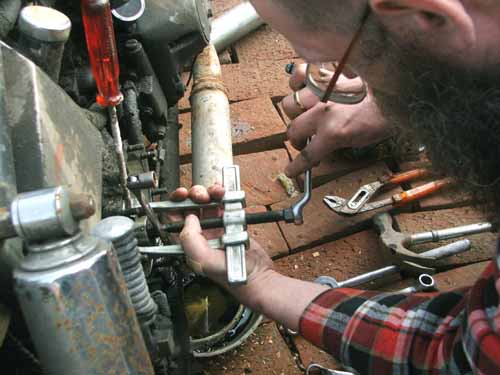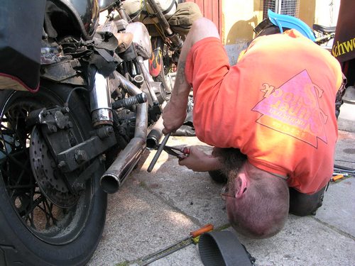 D) 20 juli 2006. Reparatie Met een campingbrandertje de onderste bocht in de apehanger zo heet mogelijk maken en dan met een baksteen zo hard mogelijk tegen het stuur slaan. Even doorzetten en het stuur is weer heel redelijk. De hoteleigenaar kent iemand die kan lassen en die maakt een provisorische voetsteun.