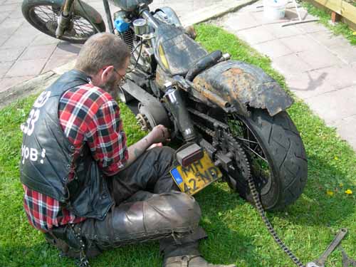 25 mei 2005. Swingarm Trouble! Zat Hildo niets vermoedend een broodje op zijn motor te eten tijdens de middagpauze op zijn werk, valt zijn oog op een scheurtje in het vet van de achterbrug. Oh? Eruit met dat ding!