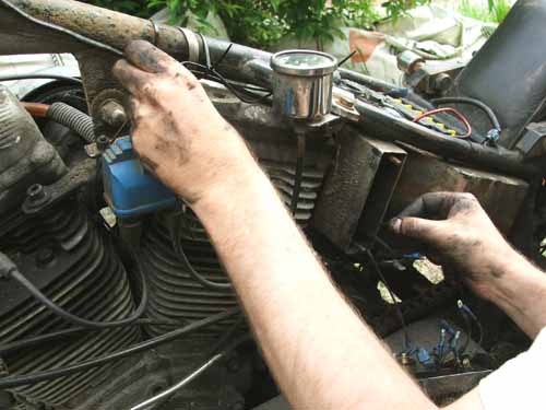 25 mei 2007. Elektrische storing Behalve af en toe wat mechanische probleempjes, heeft de oude dame op het moment van deze foto een mysterieus elektrisch probleem. Gelukkig brengt een multimeter uitkomst. 12V op de accu, maar niet bij de koplamp, of bobine. Raar. Contactslot lijkt het te zijn. Vervangen, maar het zit toch niet lekker. Hildo komt er niet echt uit, en dan is het tijd voor een rigoureuzere oplossing.