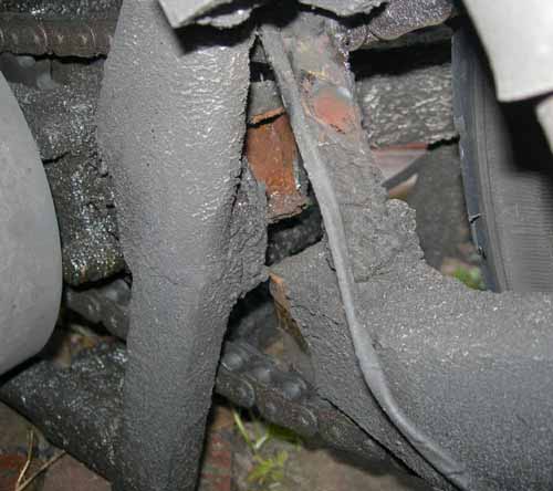 25 mei 2005. Scheurtje Na het vet weggekrabt te hebben, zag Hildo de scheur in z'n swingarm, net voor de achteras aan de bovenkant. Voelen met z'n vinger... en jawel, de scheur loopt door via de achterkant en de onderkant. Bijna helemaal afgescheurd. Alleen de voorkant zit nog vast. Op weg naar het werk nog 160 km/h gereden, mazzel gehad deze keer. Voorzichtig naar huis tuffen, lijkt slordig als je achterwiel ineens dwars in de motor staat.