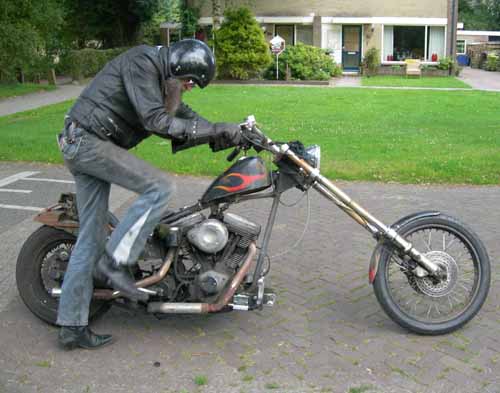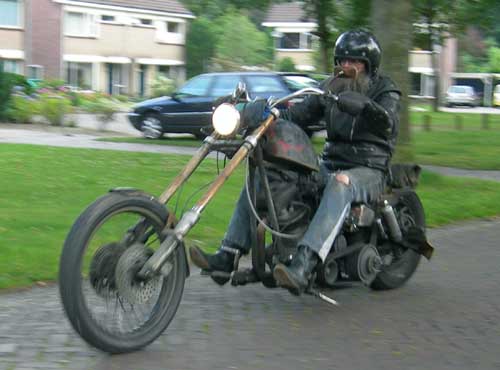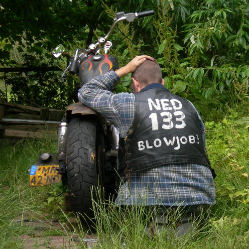 24 juni 2008. Weerzin Als u dacht dat Hildo overdreef met zijn sleutel weerzin... De motor staat er nog net zo als 2 1/2 maand geleden toen Hildo hem neerzette, behalve dan dat ie nu half overwoekerd is met gras en onkruid. Zonde? Ja, da's zeker zonde want het is inmiddels hoogzomer en heerlijk weer om te rijden, maar Hildo's hekel aan sleutelen is niet gemakkelijk te overwinnen. Het is zoiets als een diep liggend trauma, daar wordt ook ú niet graag mee geconfronteerd. Vette Vingers!! Wegbrengen om te laten repareren? Daar kan Hildo alleen maar om lachen. 'Niemand sleutelt aan mijn Harley, behalve ik', bromt hij, terwijl zijn immense 'ik moet maar ik wil niet' strijd verder woedt in zijn hoofd. Hildo moet nu diep gaan, heel diep...