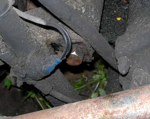 29 juni 2008. Uitlaat moer U ziet de foto van de situatie hierboven. Het bovenste moertje van de achterste uitlaatpijp wil niet goed los en, rachh... %$#@ de dop glijd over het moertje, en het moertje is rond. Die krijgt Hildo niet meer los, de uitlaat dus ook niet meer, de achterbrug as dus ook al niet meer, en de achterbrug eruit halen kan Hildo nu vergeten. Het domino effect. Even een inzinking hoor.
