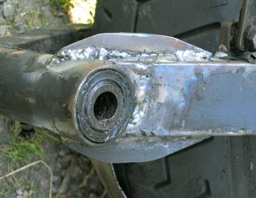 25 juli 2008 (3) Duidelijk is te zien dat de swingarm niet meer helemaal op zijn oude plaats zit. Edoch, het wiel is nog steeds gemonteerd en de arm is nu wél mooi spanningsvrij. Hildo zou met geweld, als met een krik of iets degelijks, de swingarm terug kunnen drukken naar zijn oude plek, maar het gevolg is wel extra spanning. Spanning is leuk, maar niet in achterbruggen. Hildo besluit om de arm maar op deze positie vast te lassen. Of de motor naderhand nog een beetje goed rijdt zal blijken, daarvoor trok ie ook al naar rechts, misschien gaat het straks wel beter En anders... Mwoh, gewoon het stuur een beetje naar één kant drukken tijdens het rijden, dan gaat u mooi rechtuit.