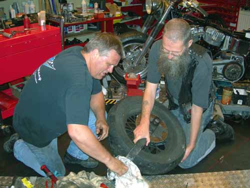 6 augustus 2004. Inside in Denemarken Verliest Hildo z'n demper ergens onderweg in Denemarken. Dichtstbijzijnde Motorcycle Storehouse dealer is Inside te Vejle en daar wordt de demper heengestuurd. Als Hildo bij Inside aankomt ziet hij het plaatje bovenaan, een dame in een Tiroler bloesje en rokje op blote voeten die super sexy de oliepomp van een Shovel eraf aan het sleutelen is. Dat komt ook u vast niet alle dagen tegen! Zij blijkt Heike, de eigenaresse van Inside. Sleutelen aan Evo's komt niet voor bij Inside niet voor, Old School only en bij de Shovels houdt het op. Gelukkig maar dat Hildo z'n eigen demper erin zetten kon. Aardige mensen bij Inside en een gezellig zaakje maar met een Evo, of godbetert zo'n nieuwe Twin Cam, bent u op het foute adres.