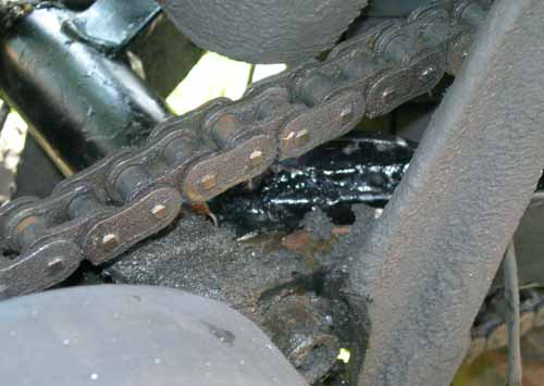13 mei 2006. Geknapte ketting Soms vindt het onderhoud onderweg plaats, u kunt het ook reparatie noemen natuurlijk. Een geknapte ketting die het spatbord wel, maar gelukkig Hildo's rug net niet raakte. Dit was een nieuw probleem voor Hildo, want een geknapte ketting had hij nog nooit gehad. Ze worden altijd ruim op tijd vervangen, maar deze was pas halverwege zijn levensduur. De ketting zelf was niet weer te vinden voor inspectie. De motorfiets even geparkeerd bij een huis van een aardige omwonende, en de volgende dag met een andere gebruikte ketting de motor weer in rijdbare staat gekregen. Tuf, daar gaat Hildo alweer.